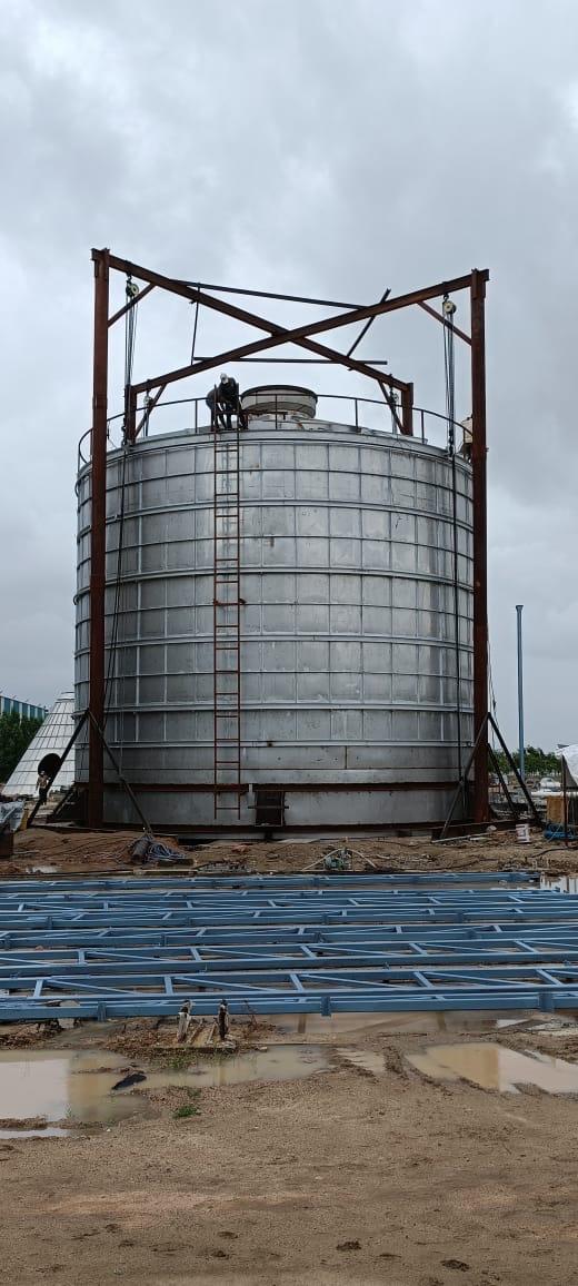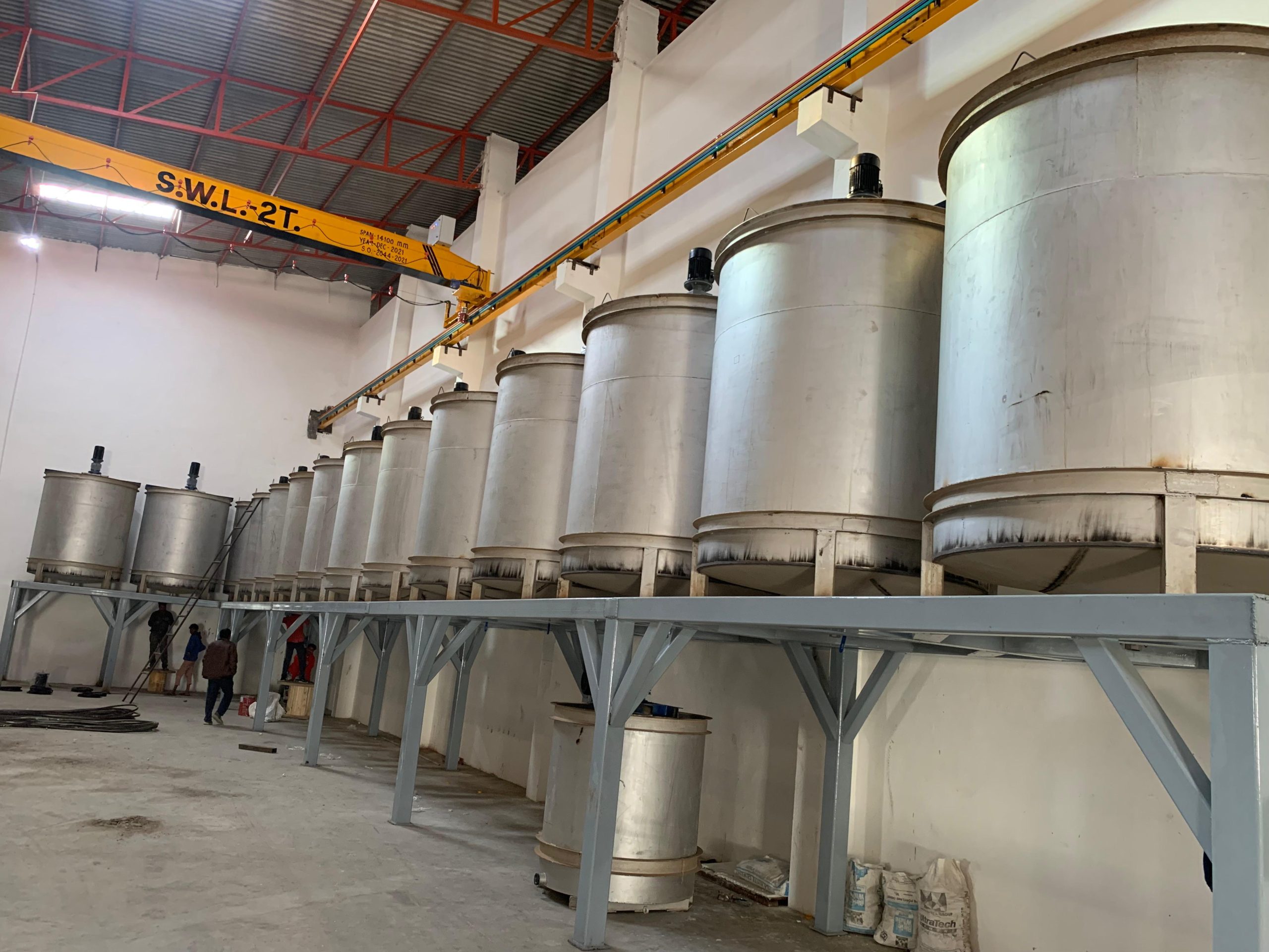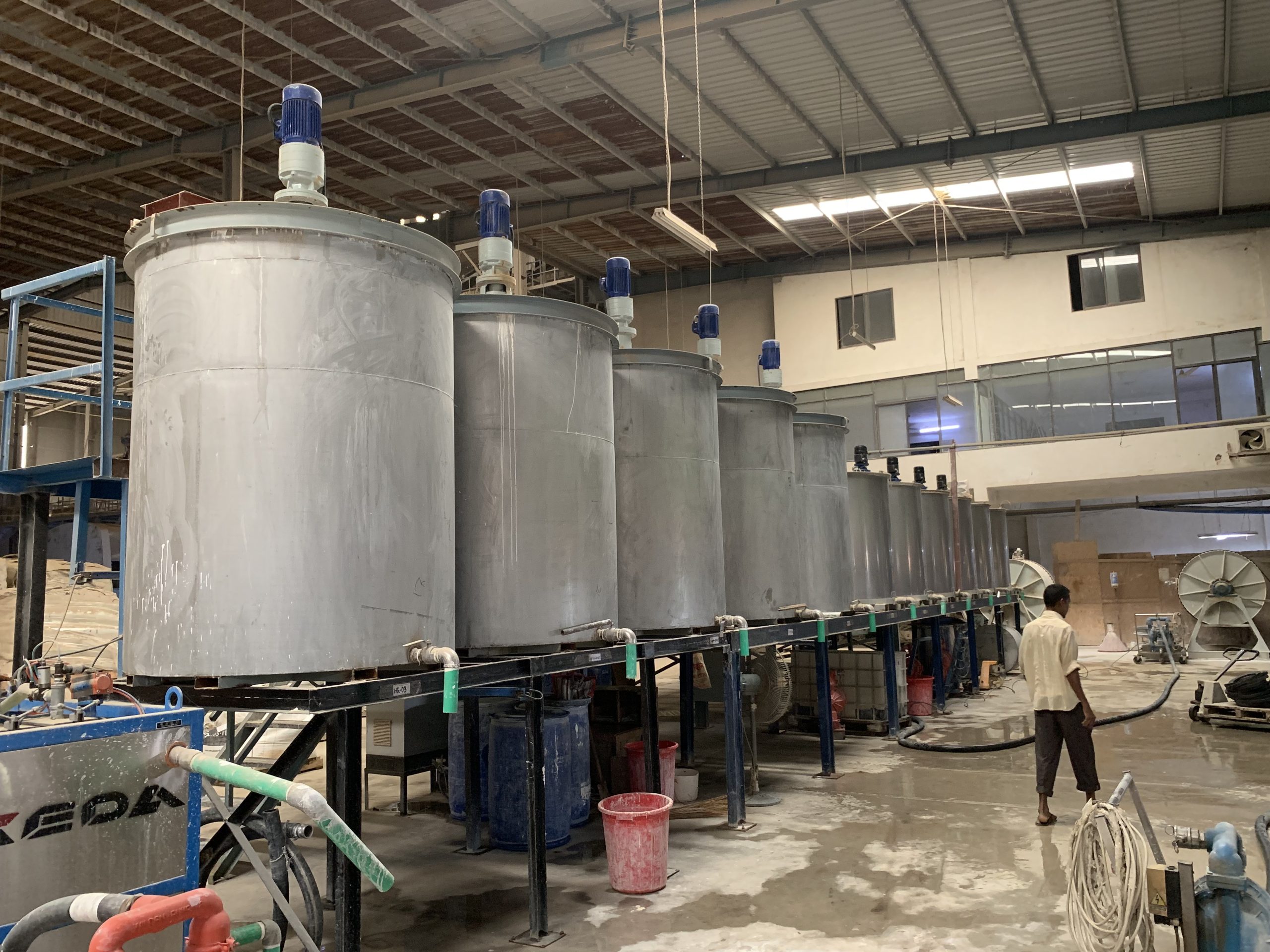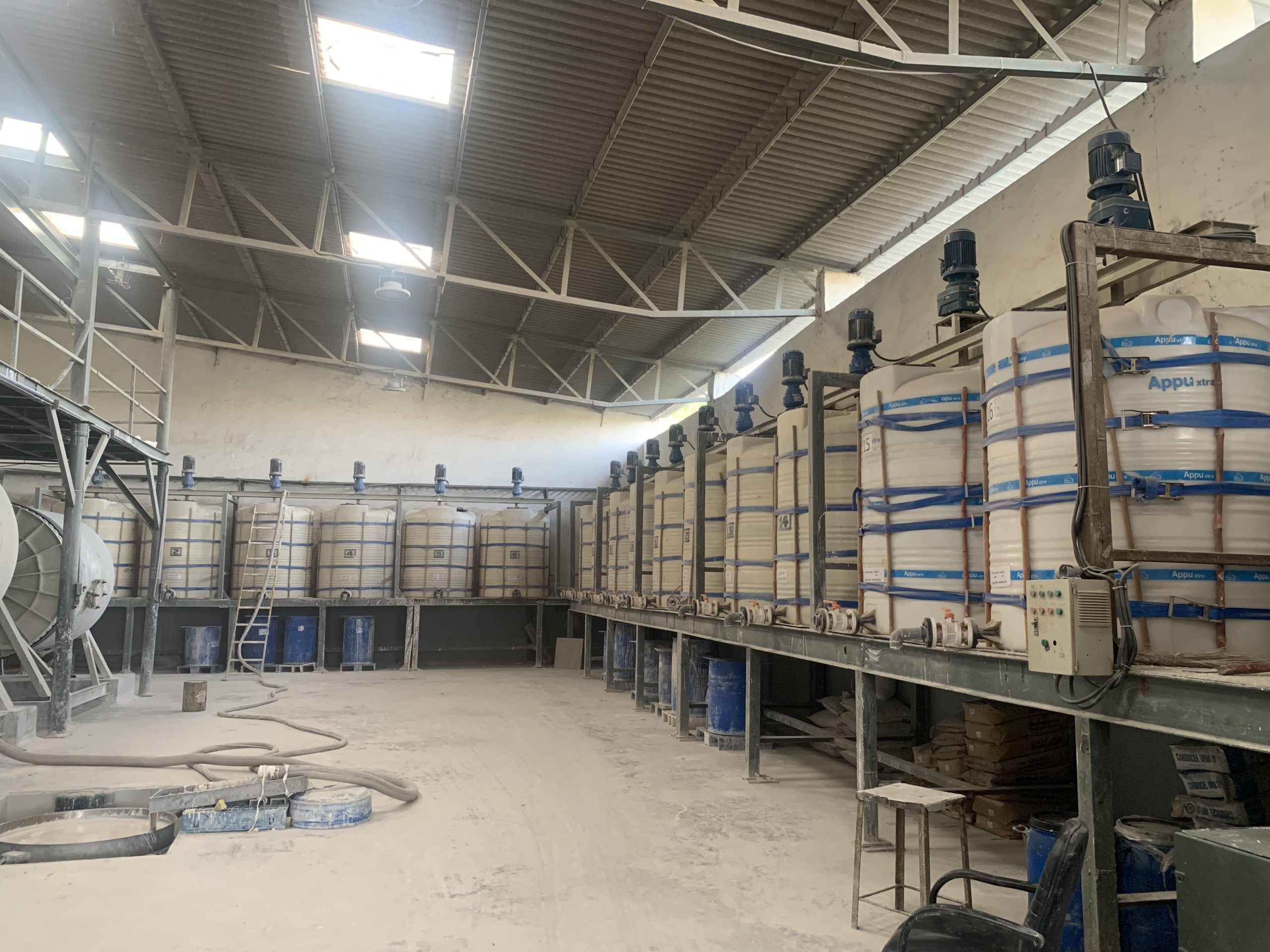 An agitator in the glaze house is used to keep the ceramic slurry well-mixed and uniform. It prevents settling of particles, maintains consistent viscosity, and ensures smooth application of glaze for high-quality tile production.