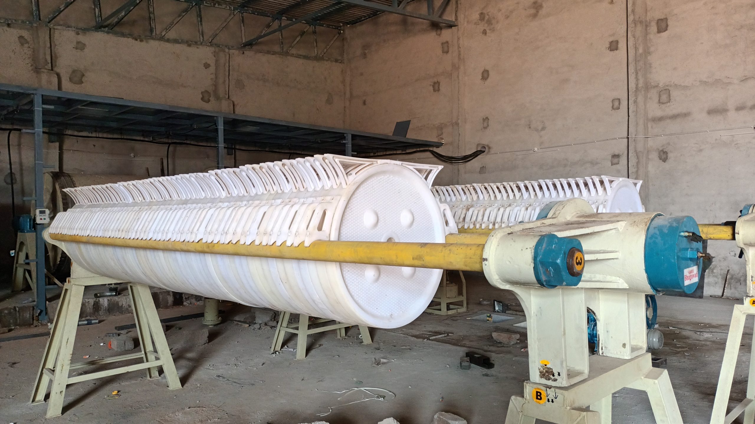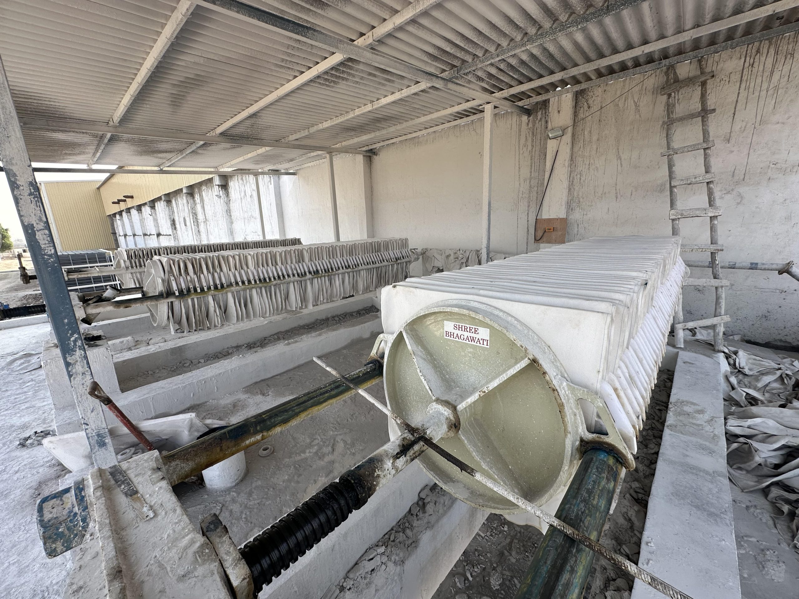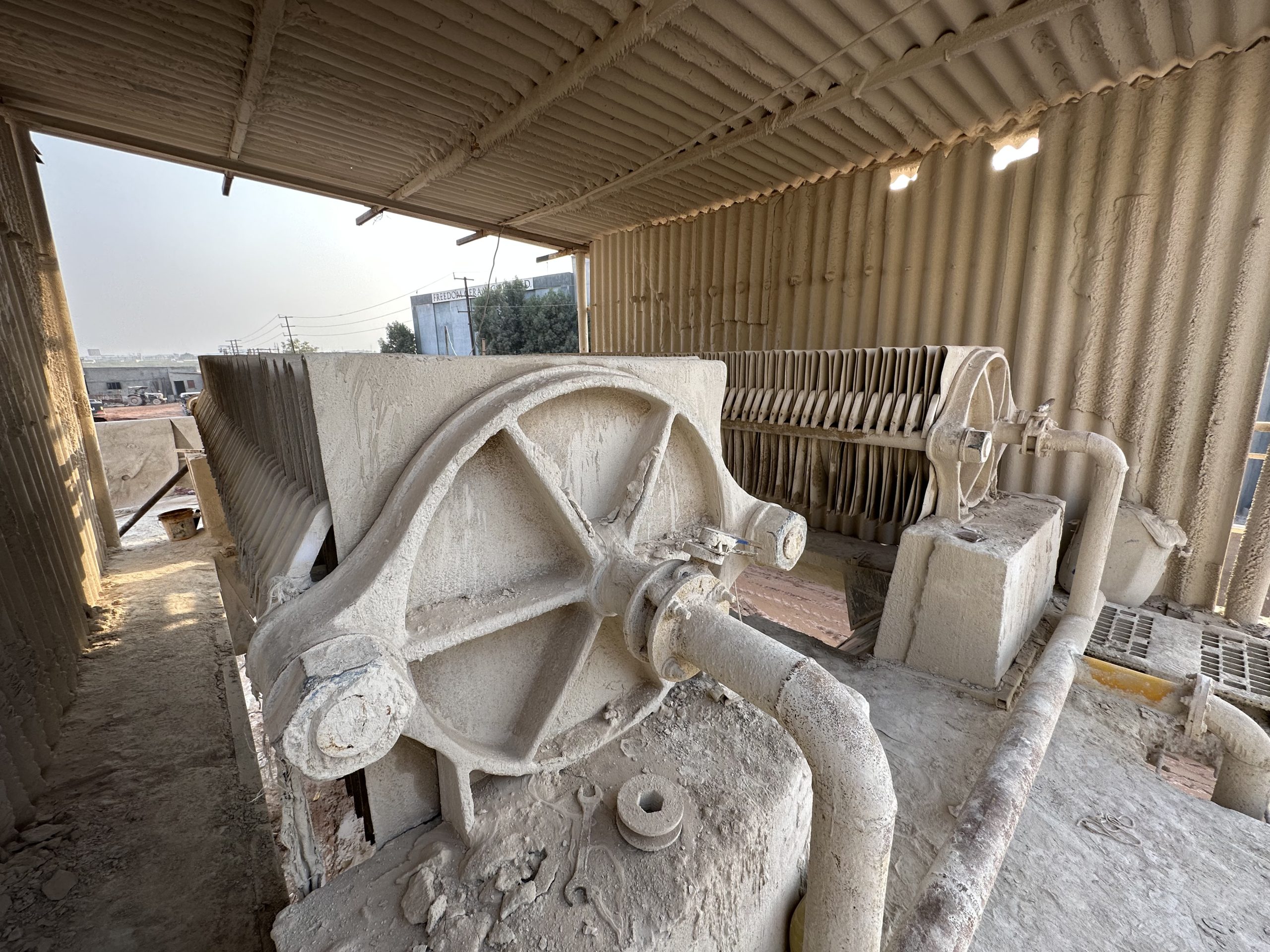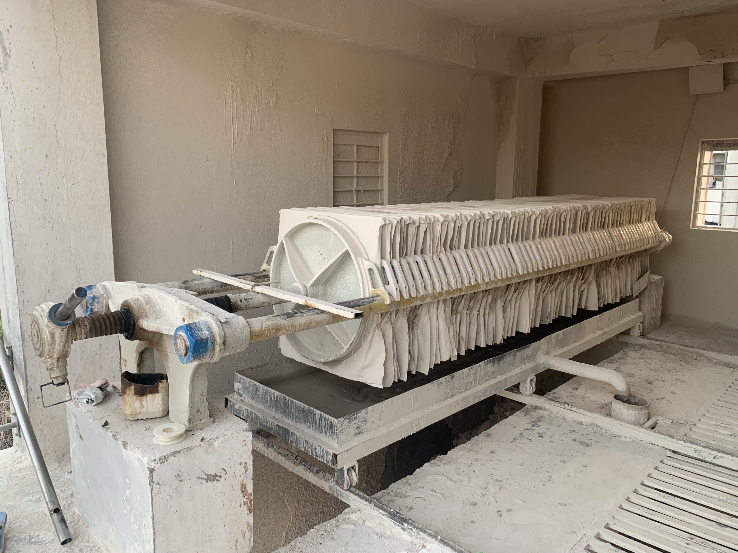 A filter press is commonly used in ETP (Effluent Treatment Plants) to separate solids from wastewater. It works by pumping sludge into plates with filter cloths, where water passes through and solids remain, forming a dry cake. This makes it highly effective for reducing sludge volume in the tile industry.